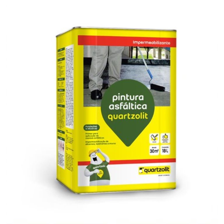 pintura asfáltica quartzolit é uma pintura asfáltica para impermeabilização de alicerces, baldrames e muros, tanques e reservatórios. Possui aderência em vários tipos de superfície como metálicas, fibrocimento, cerâmica, PVC, fibra de vidro, madeira, concreto e alvenaria.